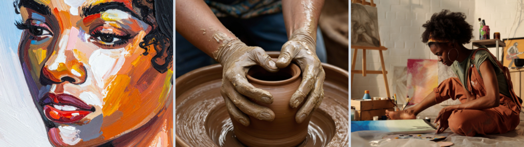You do not have to have painted since elementary school to walk into an art workshop and belong there. In fact, beginners often have the most fun — unburdened by expectation, open to experimentation. Whether it’s watercolor, acrylics, mixed media collage, or even fiber arts and quilting (a profound Black American tradition), visual expression opens channels that words alone cannot.